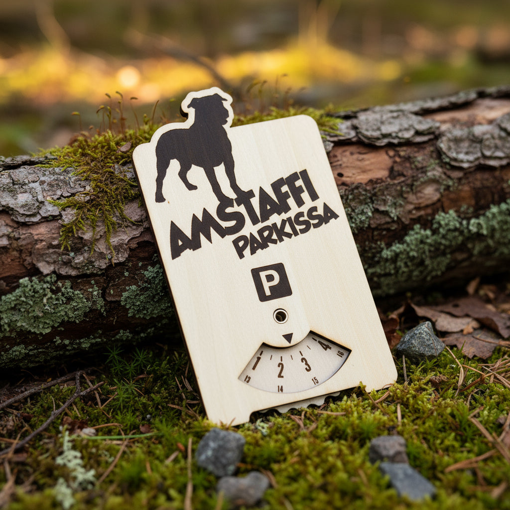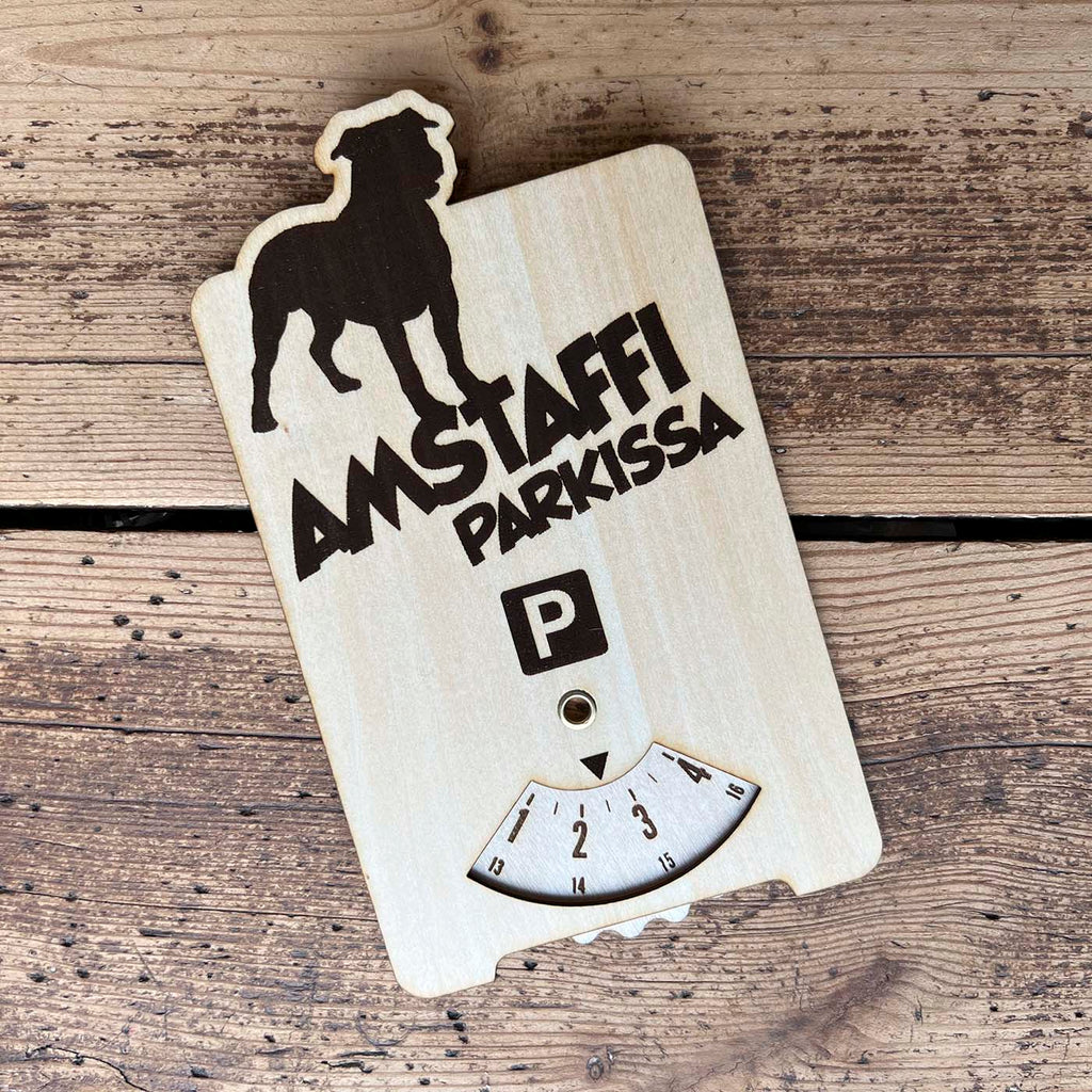 Vanerista valmistettu hauska parkkikiekko koiran omistajalle. Puinen amstaffi parkkikiekko on luontoystävällinen valinta, kuviot on poltettu laserilla, joten niissäkään ei ole käytetty painovärejä tms. Ekologinen valinta, joka ei päädy muoviroskan tapaan meriä kiertämään.